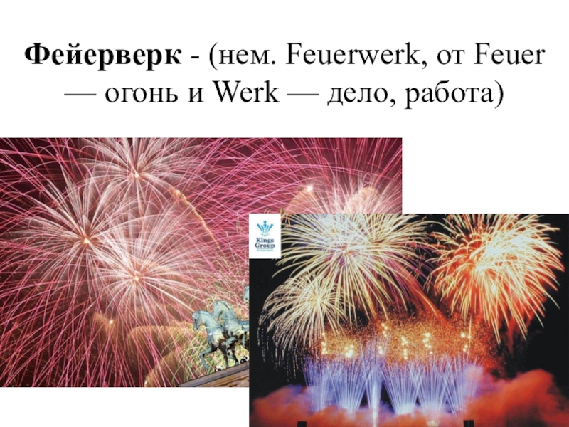 Слайд 5Фейерверк - (нем. Feuerwerk, от Feuer — огонь и Werk — дело,