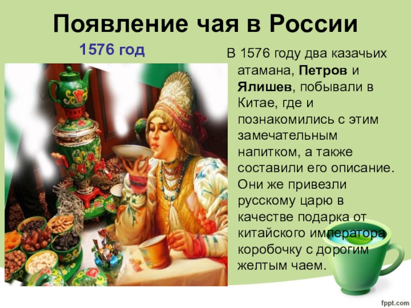 Петров и Ялишев, побывали в Китае, где и познакомились с этим замечательным напитком, а также составили его описание. Они же привезли русскому царю в качестве подарка от китайского императора коробочку с дорогим желтым чаем.