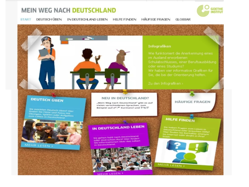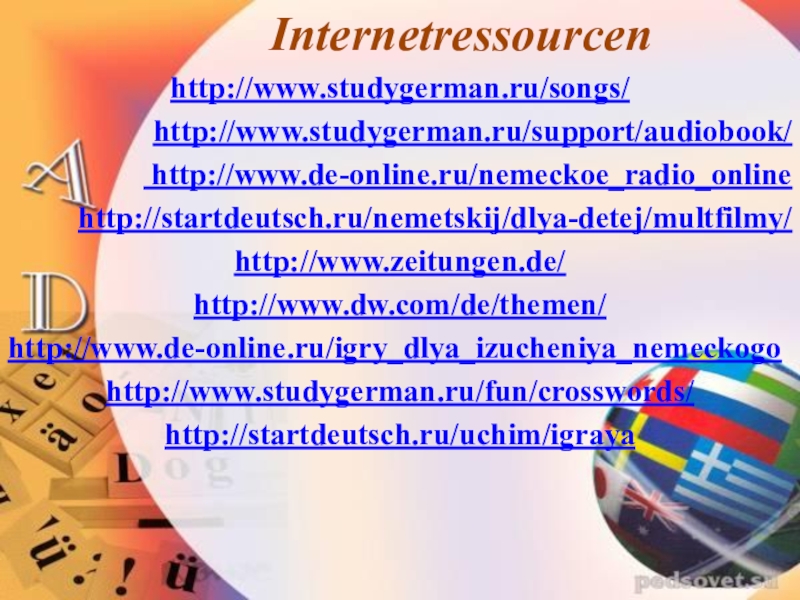 Internetressourcenhttp://www.studygerman.ru/songs/http://www.studygerman.ru/support/audiobook/ http://www.de-online.ru/nemeckoe_radio_onlinehttp://startdeutsch.ru/nemetskij/dlya-detej/multfilmy/http://www.zeitungen.de/http://www.dw.com/de/themen/http://www.de-online.ru/igry_dlya_izucheniya_nemeckogohttp://www.studygerman.ru/fun/crosswords/http://startdeutsch.ru/uchim/igraya
