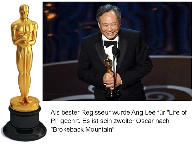 Слайд 9Als bester Regisseur wurde Ang Lee für "Life of Pi" geehrt.