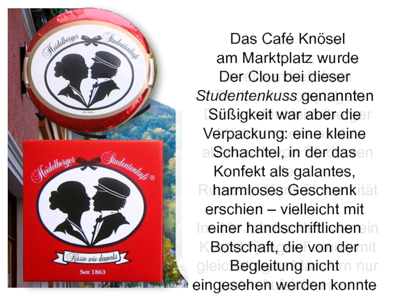 Der Clou bei dieser Studentenkuss genannten Süßigkeit war aber die Verpackung: eine kleine Schachtel, in der das Konfekt als galantes, harmloses Geschenk erschien – vielleicht mit einer handschriftlichen Botschaft, die von der Begleitung nicht eingesehen werden konnte