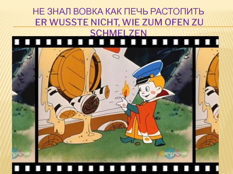 Слайд 9Не знал Вовка как печь растопить Er wusste nicht, wie zum