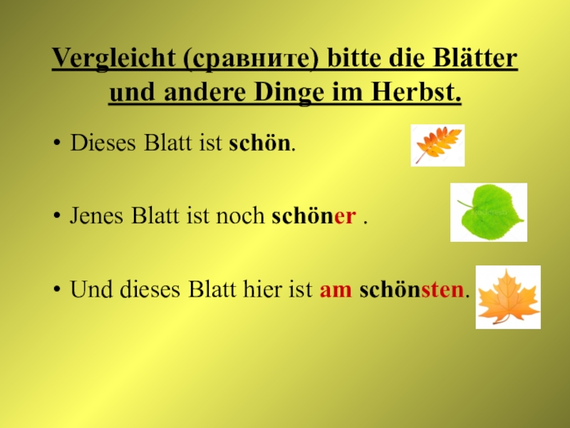 Слайд 14Vergleicht (сравните) bitte die Blätter und andere Dinge im Herbst.