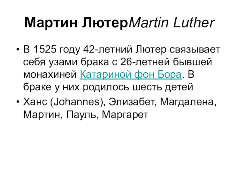 с 26-летней бывшей монахиней Катариной фон Бора. В браке у них родилось шесть детей