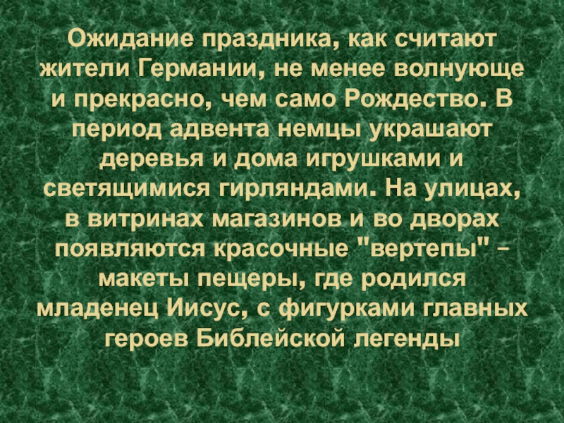 чем само Рождество. В период адвента немцы украшают деревья и дома игрушками и светящимися гирляндами. На улицах, в витринах магазинов и во дворах появляются красочные "вертепы" – макеты пещеры, где родился младенец Иисус, с фигурками главных героев Библейской легенды