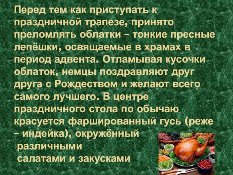 тонкие пресные лепёшки, освящаемые в храмах в период адвента. Отламывая кусочки облаток, немцы поздравляют друг друга с Рождеством и желают всего самого лучшего. В центре праздничного стола по обычаю красуется фаршированный гусь (реже – индейка), окружённый