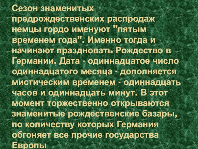 тогда и начинают праздновать Рождество в Германии. Дата - одиннадцатое число одиннадцатого месяца - дополняется мистическим временем - одиннадцать часов и одиннадцать минут. В этот момент торжественно открываются знаменитые рождественские базары, по количеству которых Германия обгоняет все прочие государства Европы