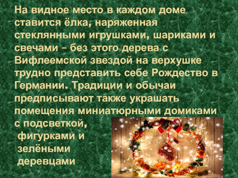 шариками и свечами – без этого дерева с Вифлеемской звездой на верхушке трудно представить себе Рождество в Германии. Традиции и обычаи предписывают также украшать помещения миниатюрными домиками