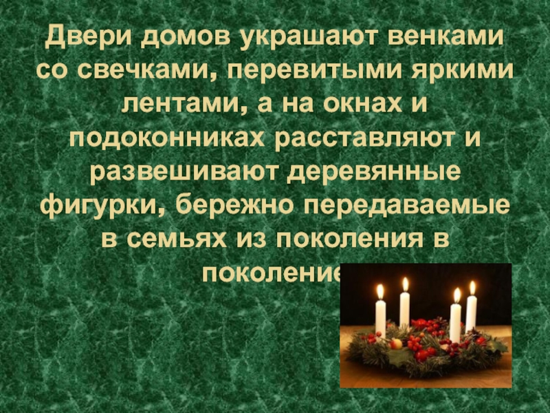 Двери домов украшают венками со свечками, перевитыми яркими лентами, а на