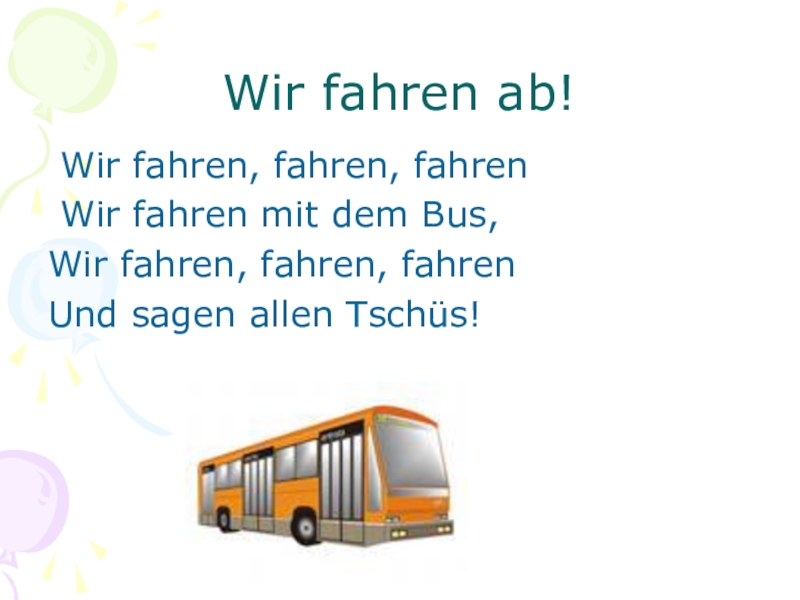 Wir fahren ab! Wir fahren, fahren, fahren Wir fahren mit dem Bus,Wir fahren, fahren, fahrenUnd sagen allen