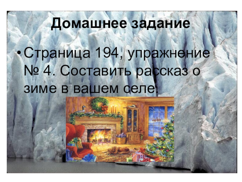 Домашнее заданиеСтраница 194, упражнение № 4. Составить рассказ о зиме в вашем селе.