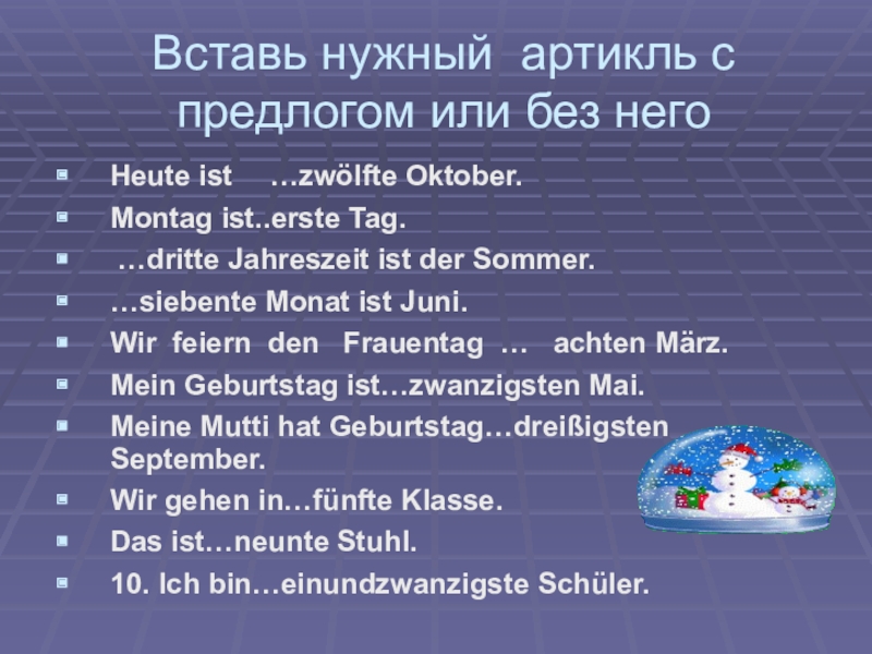 Вставь нужный артикль с предлогом или без негоHeute ist	…zwölfte Oktober.Montag ist..erste Tag. …dritte Jahreszeit ist der Sommer.…siebente