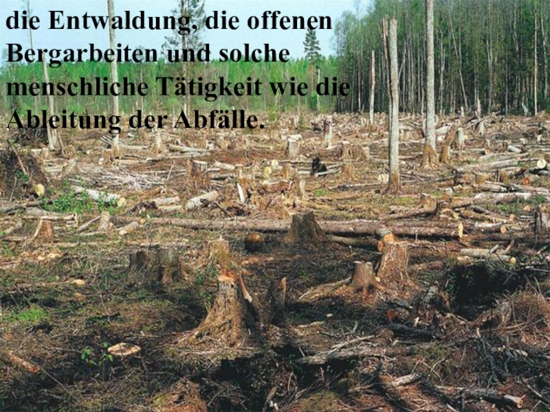 Слайд 11die Entwaldung, die offenen Bergarbeiten und solche menschliche Tätigkeit wie die
