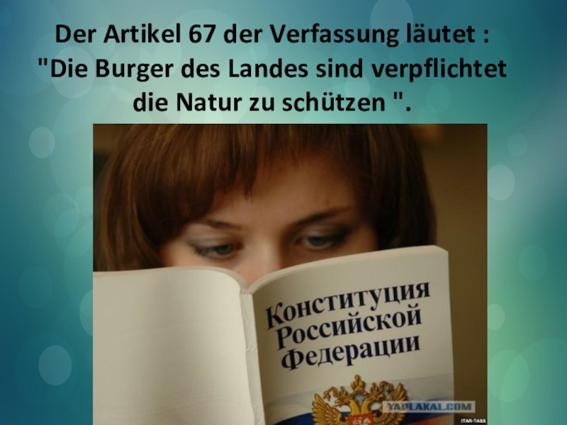 Слайд 14Der Artikel 67 der Verfassung läutet : "Die Burger des Landes