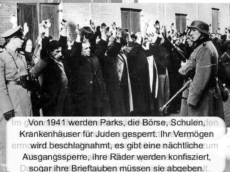 Von 1941 werden Parks, die Börse, Schulen, Krankenhäuser für Juden gesperrt. Ihr Vermögen wird beschlagnahmt, es gibt eine nächtliche Ausgangssperre, ihre Räder werden konfisziert, sogar ihre Brieftauben müssen sie abgeben.