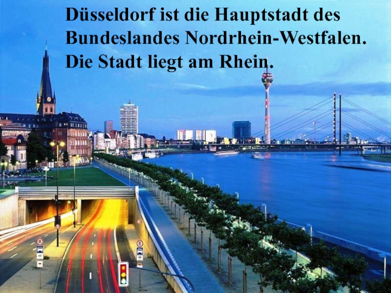 Слайд 2Düsseldorf ist die Hauptstadt des Bundeslandes Nordrhein-Westfalen. Die Stadt liegt am