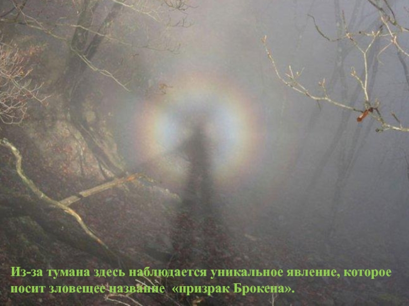 Интереса к Брокену добавляют специфические погодные условия на вершине, которые не соответствуют ни местному климату, ни высоте горы. Погодные условия удивительные и во многом подчеркивают мистическую и мрачную славу Брокена. На вершине горы холодно даже в разгар лета — среднегодовая температура здесь всего 3°С. Почти полгода на макушке горы Брокен лежит снег. Здесь непрестанно дует пронзительный ветер. 300 дней в году вершина горы покрыта густым туманом.