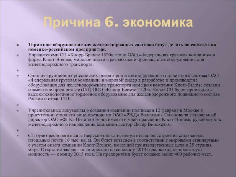 Один из крупнейших российских операторов железнодорожного подвижного состава ОАО «Федеральная грузовая компания» и мировой лидер в разработке и производстве оборудования для железнодорожного транспорта немецкая компания Knorr-Bremse создали совместное предприятие (СП) ООО «Кнорр-Бремзе 1520». Новое СП будет производить высокотехнологичное тормозное оборудование для железнодорожного подвижного состава России и стран СНГ.