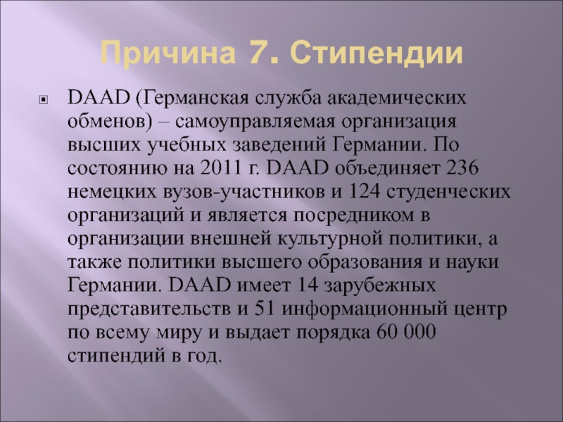 учебных заведений Германии. По состоянию на 2011 г. DAAD объединяет 236 немецких вузов-участников и 124 студенческих организаций и является посредником в организации внешней культурной политики, а также политики высшего образования и науки Германии. DAAD имеет 14 зарубежных представительств и 51 информационный центр по всему миру и выдает порядка 60 000 стипендий в год.