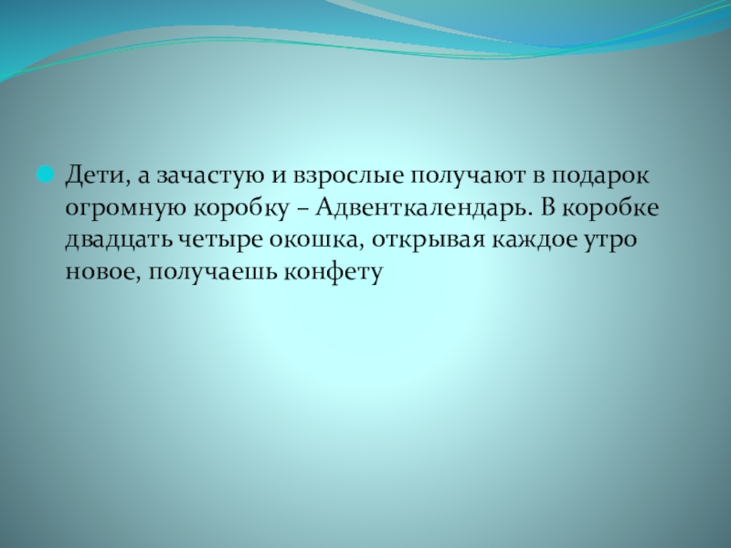 Адвенткалендарь. В коробке двадцать четыре окошка, открывая каждое утро новое, получаешь конфету