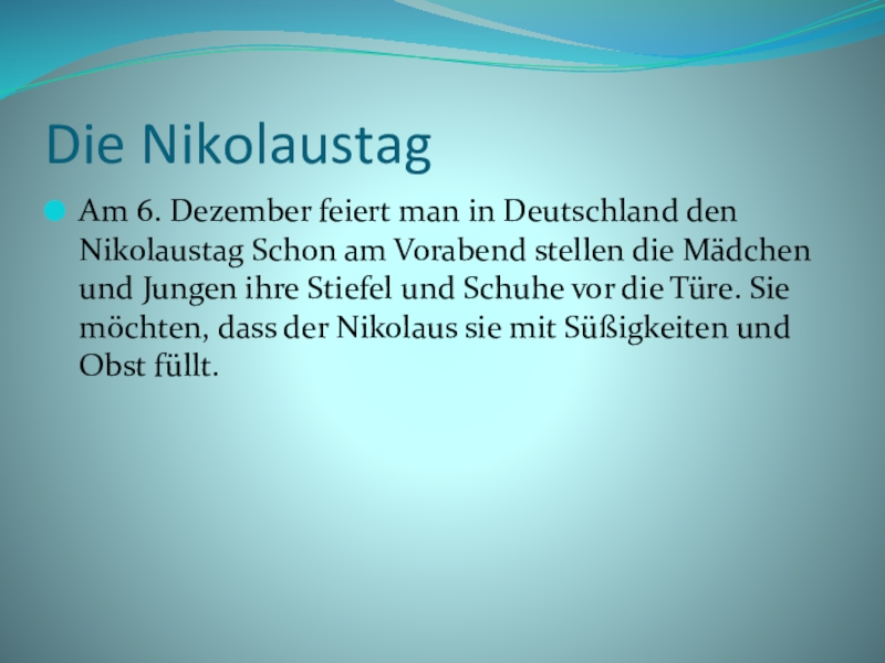 декабря. И является для детей и их родителей не только символом подарков, но и несёт в себе воспитательную функцию. Дети, которые хорошо себя ведут, подарки получают, и наоборот, непослушных святой Николаус наказывает, и подарков лишает. Здесь уже вошло в традицию, когда вечером дети собираются в группы, звонят соседям в дверь, рассказывают стихи, поют рождественские песенки. За это они получают конфеты и различные сладости…