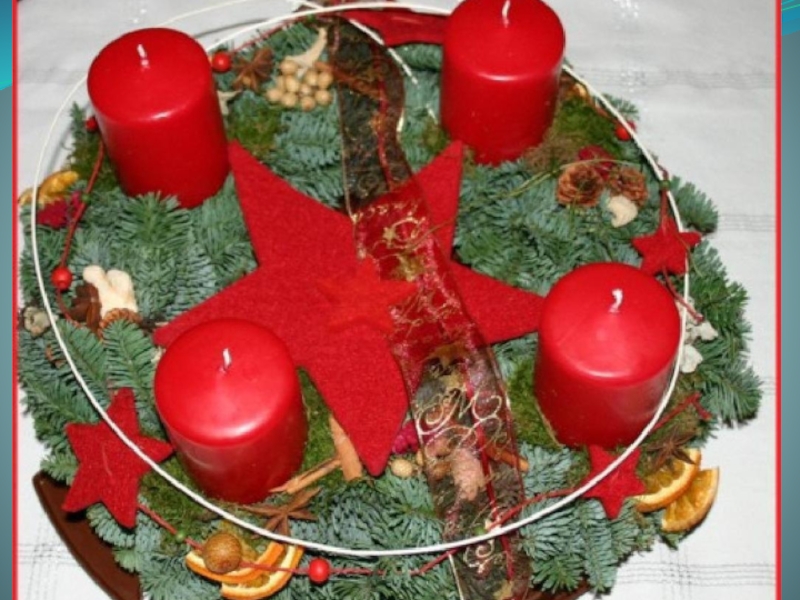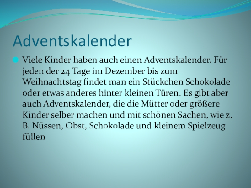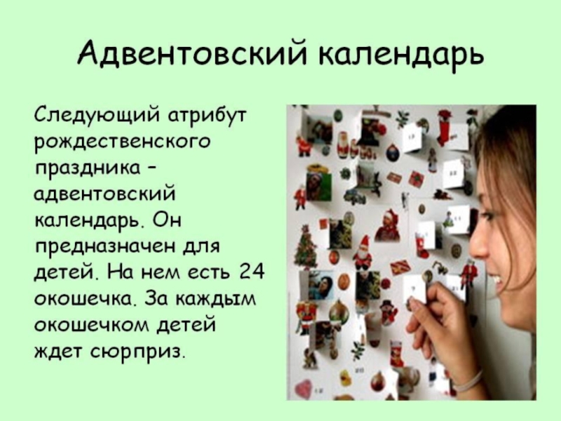 im Dezember bis zum Weihnachtstag findet man ein Stückchen Schokolade oder etwas anderes hinter kleinen Türen. Es gibt aber auch Adventskalender, die die Mütter oder größere Kinder selber machen und mit schönen Sachen, wie z. B. Nüssen, Obst, Schokolade und kleinem Spielzeug füllen
