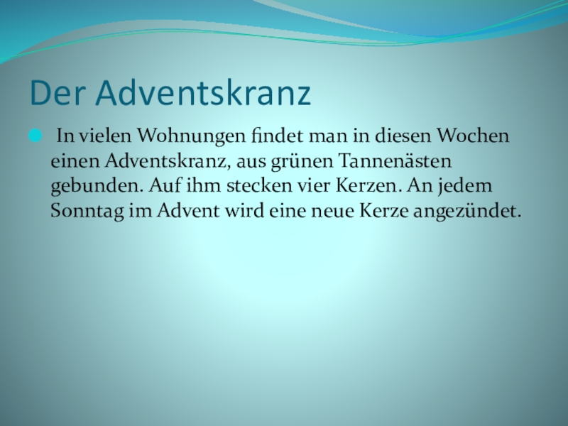 Zeit im Jahr. Überall auf der Welt wird sie gefeiert, wenn auch viele Bräuche in Europa ihren Anfang genommen haben. Wie diese Zeit in Deutschland gefeiert wird, möchten wir in dieser Arbeit kurz beschreiben.1. Advent: Jesus kommt bald wiederIn der Adventszeit bereiten Deutschen sich auf Weihnachten vor. Das Wort «Advent» kommt aus der lateinischen Sprache und heißt «Ankunft». In dieser Zeit denken sie daran, dass Jesus Christus als Kind in diese Welt gekommen ist und dass er als Hеrr bald wiederkommen wird.