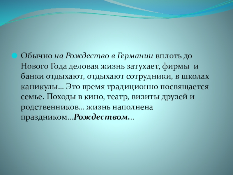 Слайд 38Обычно на Рождество в Германии вплоть до Нового Года деловая жизнь затухает, фирмы