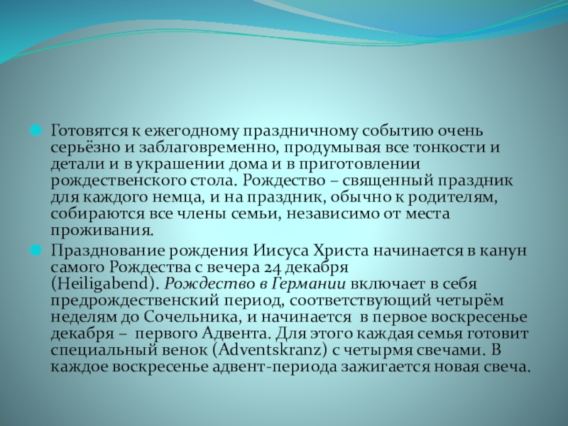 тонкости и детали и в украшении дома и в приготовлении рождественского стола. Рождество – священный праздник для каждого немца, и на праздник, обычно к родителям, собираются все члены семьи, независимо от места проживания.
