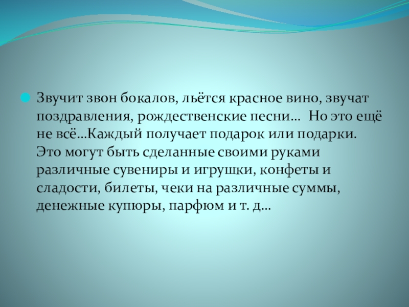 Слайд 8Звучит звон бокалов, льётся красное вино, звучат поздравления, рождественские песни… Но