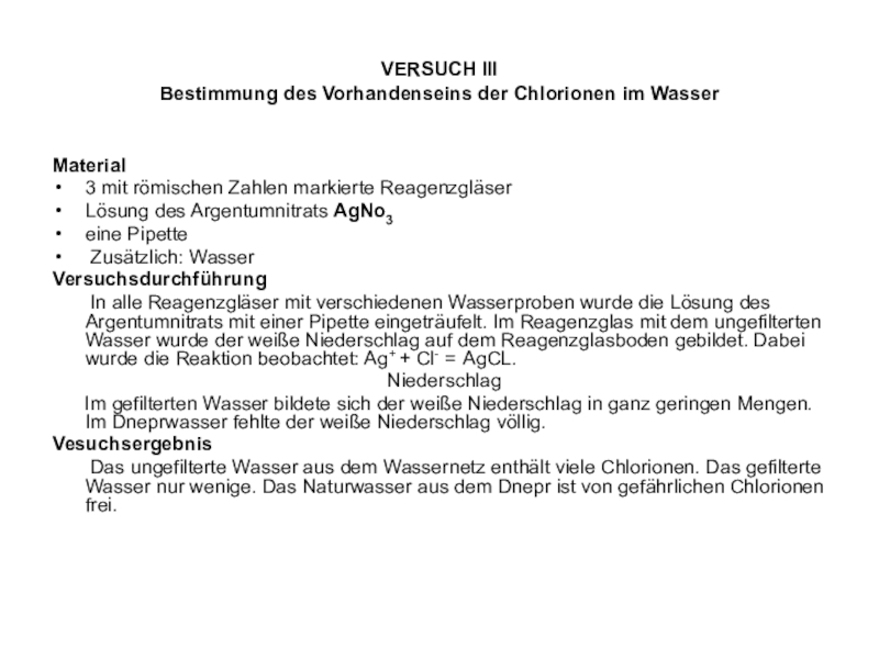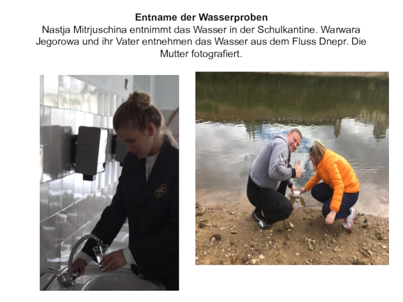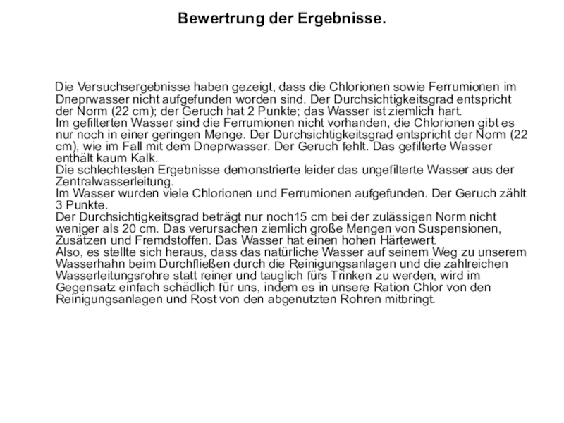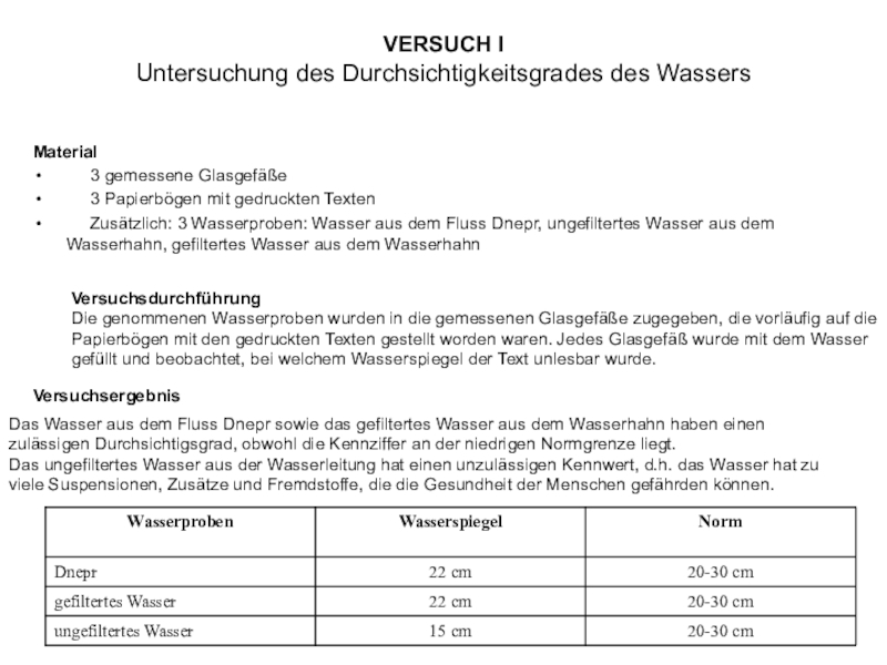 Das Wasser aus dem Fluss Dnepr sowie das gefiltertes Wasser aus dem Wasserhahn haben einen zulässigen Durchsichtigsgrad, obwohl die Kennziffer an der niedrigen Normgrenze liegt.