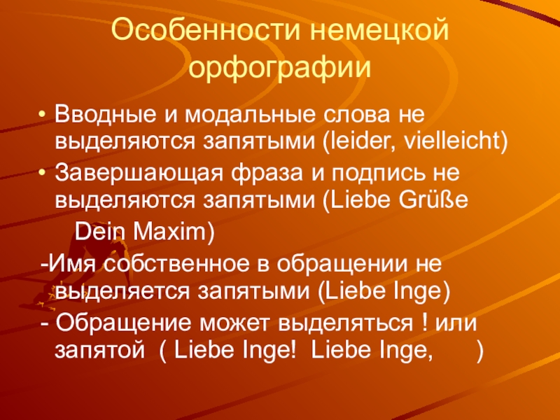- Обращение может выделяться ! или запятой ( Liebe Inge! Liebe Inge, )