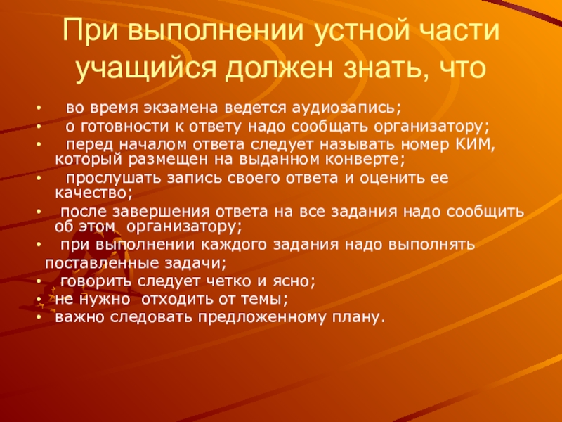 Слайд 21При выполнении устной части учащийся должен знать, что