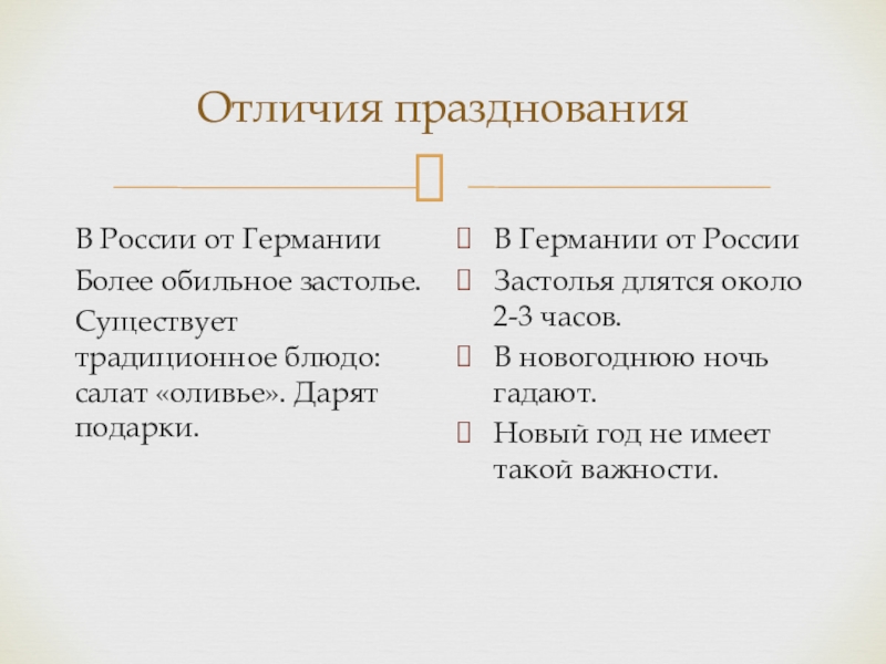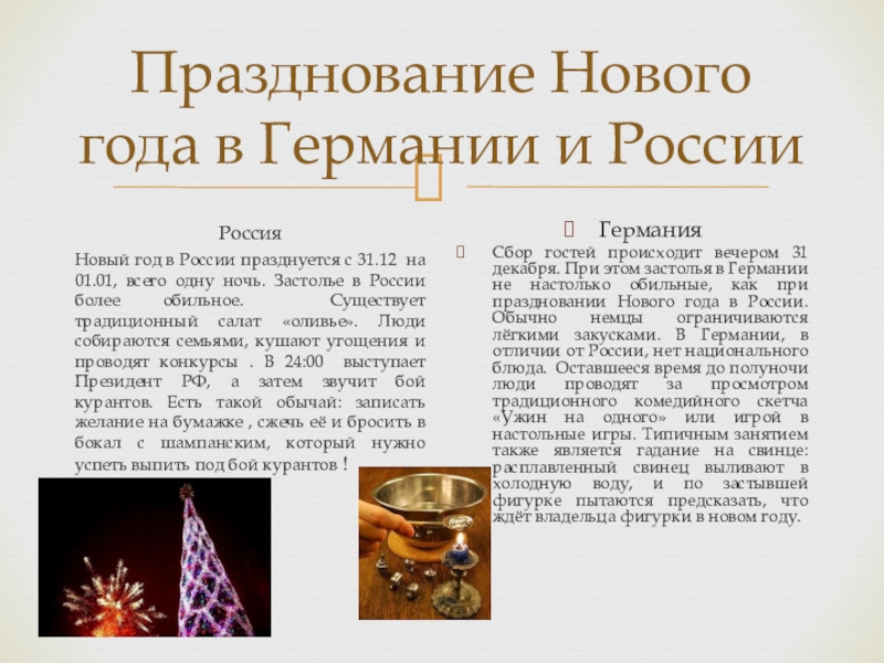 Сбор гостей происходит вечером 31 декабря. При этом застолья в Германии не настолько обильные, как при праздновании Нового года в России. Обычно немцы ограничиваются лёгкими закусками. В Германии, в отличии от России, нет национального блюда. Оставшееся время до полуночи люди проводят за просмотром традиционного комедийного скетча «Ужин на одного» или игрой в настольные игры. Типичным занятием также является гадание на свинце: расплавленный свинец выливают в холодную воду, и по застывшей фигурке пытаются предсказать, что ждёт владельца фигурки в новом году.