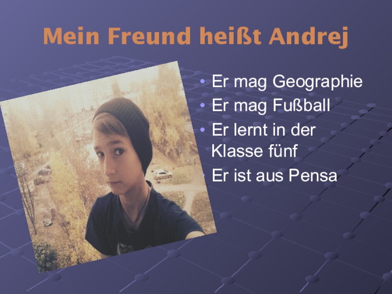 -Das ist mein Freund Danil. Er kommt aus Pensa. Er ist 11 Jahre alt. Er mag Mathe und Englisch. Er lernt in der Klasse 5. Sport mag er nicht, aber er tanzt gern.