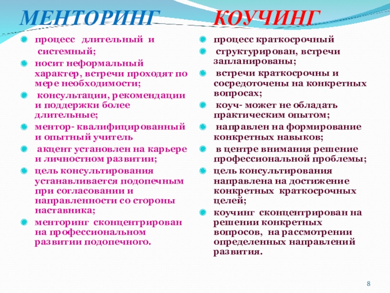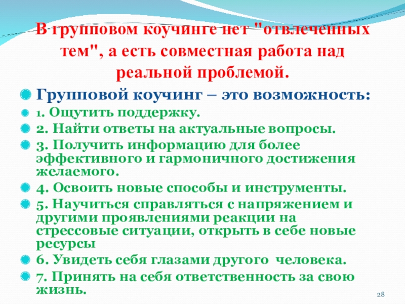 коучинг сконцентрирован на решении конкретных вопросов, на рассмотрении определенных направлений развития.