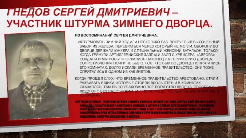 Слайд 28ГНЕДОВ СЕРГЕЙ ДМИТРИЕВИЧ – УЧАСТНИК ШТУРМА ЗИМНЕГО ДВОРЦА.