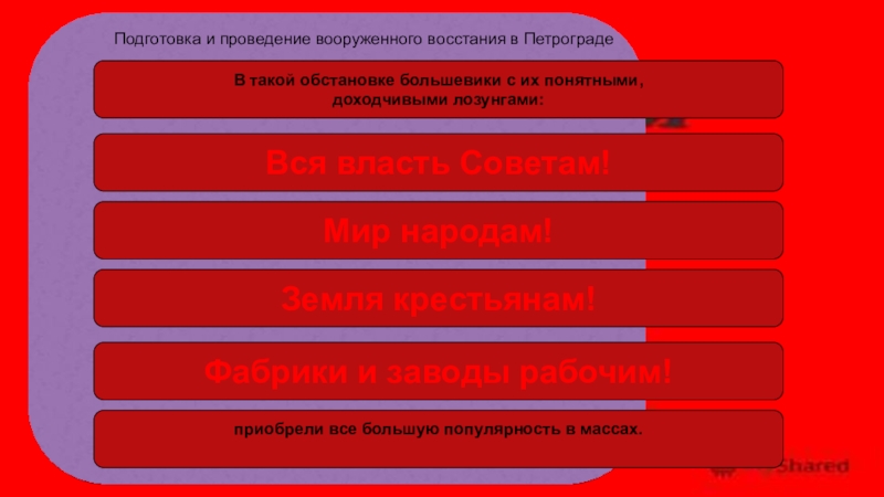 Влияние большевиков в России росло. В середине сентября В.И. Ленин разработал план вооруженного восстания. Главной целью октябрьской революции было завоевание власти Советами.