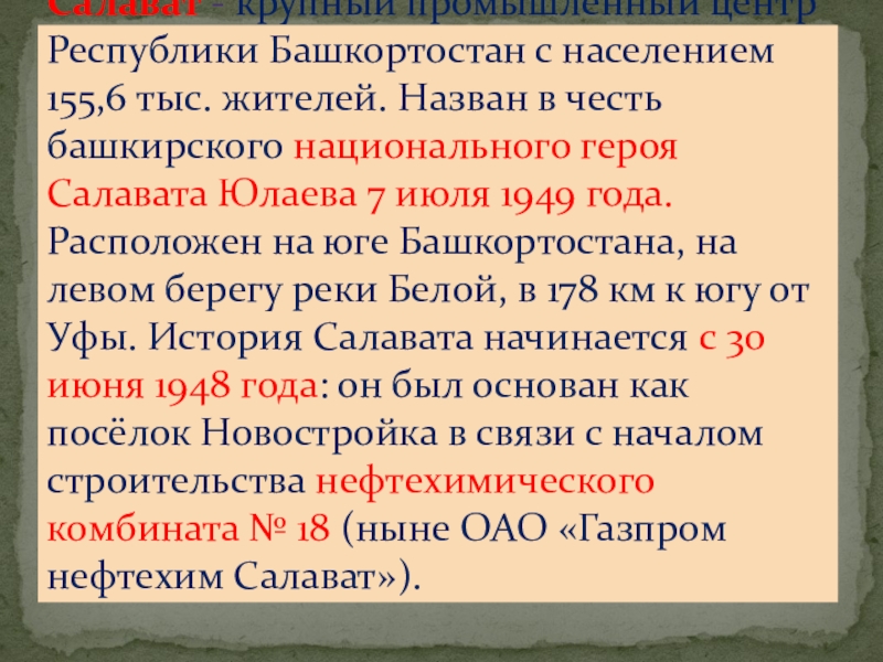 Слайд 2Салават - крупный промышленный центр Республики Башкортостан с населением 155,6 тыс.