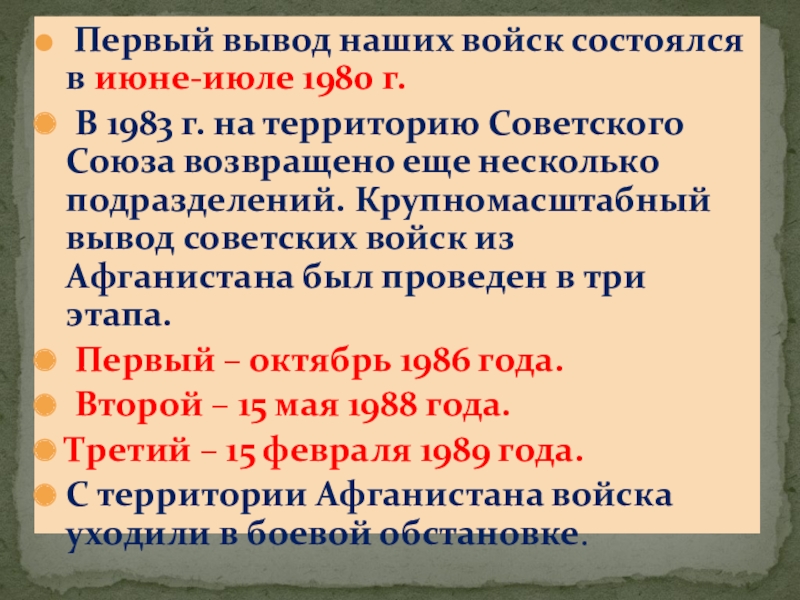 Слайд 32 Первый вывод наших войск состоялся в июне-июле 1980 г.