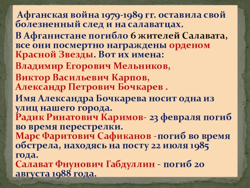 В Афганистане погибло 6 жителей Салавата, все они посмертно награждены орденом Красной Звезды. Вот их имена:
