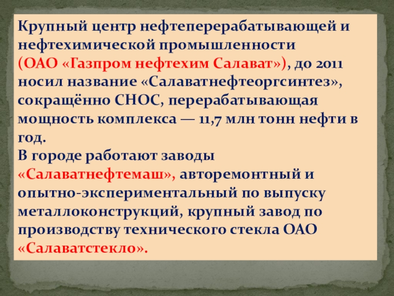 2011 носил название «Салаватнефтеоргсинтез», сокращённо СНОС, перерабатывающая мощность комплекса — 11,7 млн тонн нефти в год.