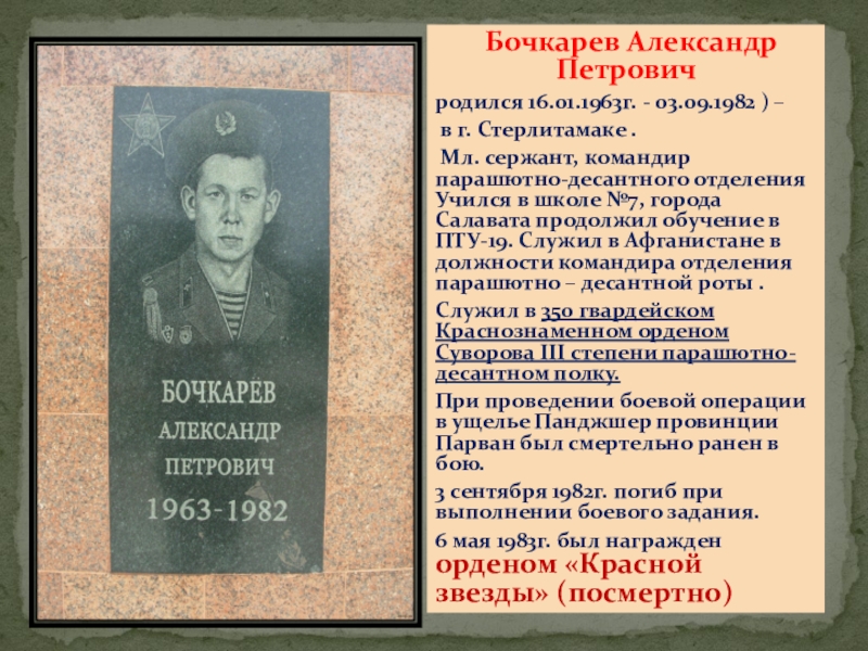 Мл. сержант, командир парашютно-десантного отделения Учился в школе №7, города Салавата продолжил обучение в ПТУ-19. Служил в Афганистане в должности командира отделения парашютно – десантной роты .