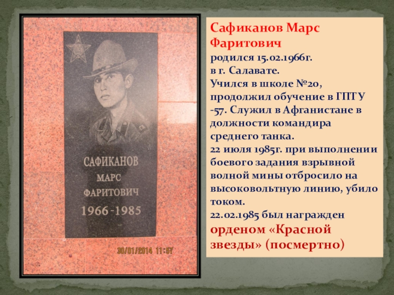 Марс Фаритович Сафиканов -погиб во время обстрела, находясь на посту 22 июля 1985 года.