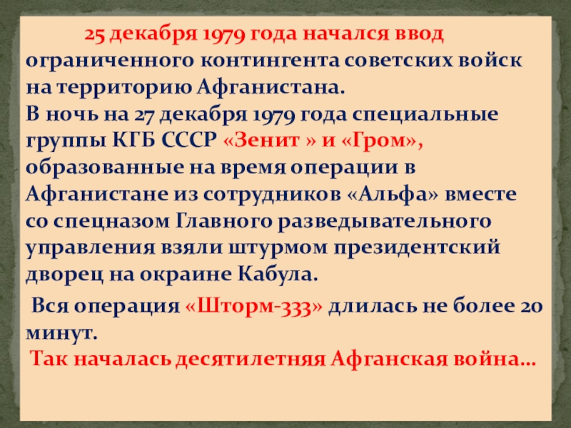 В ночь на 27 декабря 1979 года специальные группы КГБ СССР «Зенит » и «Гром», образованные на время операции в Афганистане из сотрудников «Альфа» вместе со спецназом Главного разведывательного управления взяли штурмом президентский дворец на окраине Кабула.