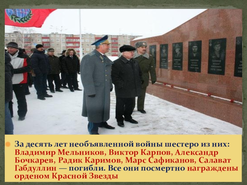 За десять лет необъявленной войны шестеро из них: Владимир Мельников, Виктор Карпов, Александр Бочкарев, Радик Каримов, Марс Сафиканов, Салават Габдуллин — погибли. Все они посмертно награждены орденом Красной Звезды
