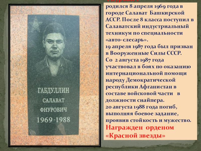 Салават Фнунович Габдуллин - погиб 20 августа 1988 года.