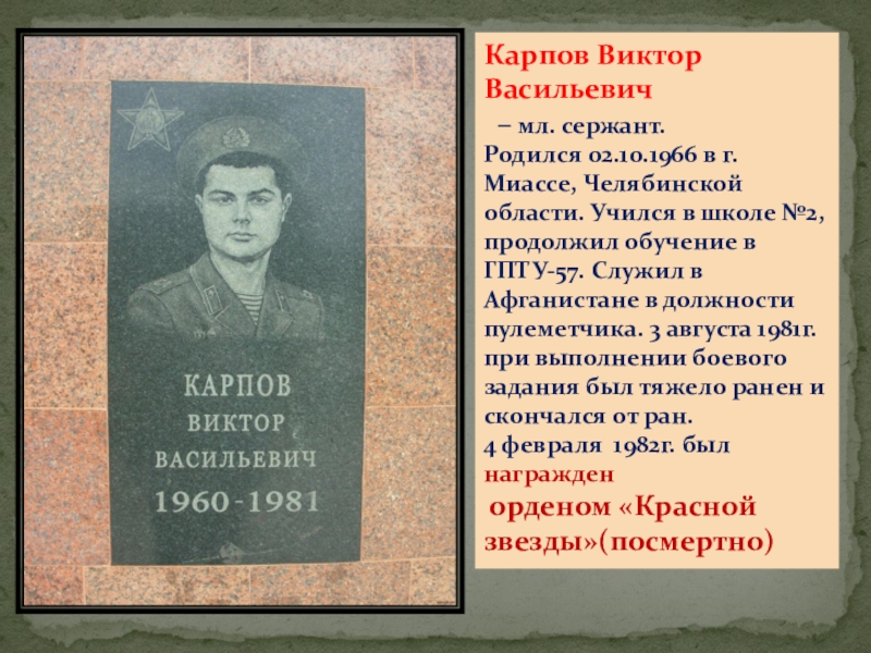 – мл. сержант. Родился 02.10.1966 в г.Миассе, Челябинской области.