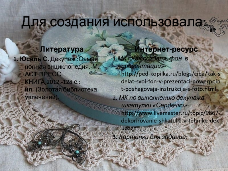 2. МК по выполнению декупажа шкатулки «Сердечко»- http://www.livemaster.ru/topic/9867-dekorirovanie-shkatulki-v-tehnike-dekupazh