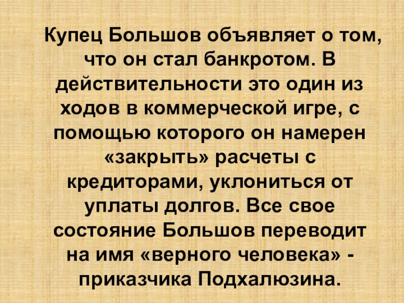 это один из ходов в коммерческой игре, с помощью которого он намерен «закрыть» расчеты с кредиторами, уклониться от уплаты долгов. Все свое состояние Большов переводит на имя «верного человека» - приказчика Подхалюзина.